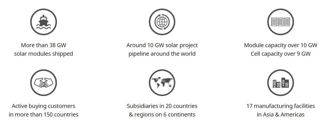 Canadian Solar đã cung cấp hơn 38 GW mô-đun năng lượng mặt trời cho hàng ngàn khách hàng tại hơn 150 quốc gia, đủ để đáp ứng nhu cầu năng lượng xanh, sạch của khoảng 10 triệu hộ gia đình. Canadian Solar có gần 13.000 nhân viên tận tụy phấn đấu mỗi ngày để biến sứ mệnh này thành hiện thực.
