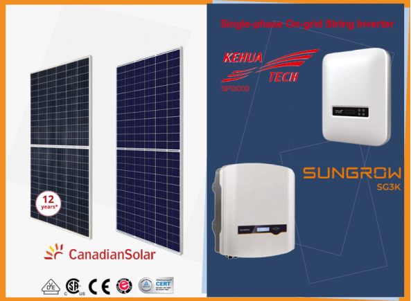 Bao gồm 9 tấm Panel CANADIAN SOLAR Poly PERC 365W half cells+Inverter hoà lưới 1 pha, 3 kW, 2 MMPT